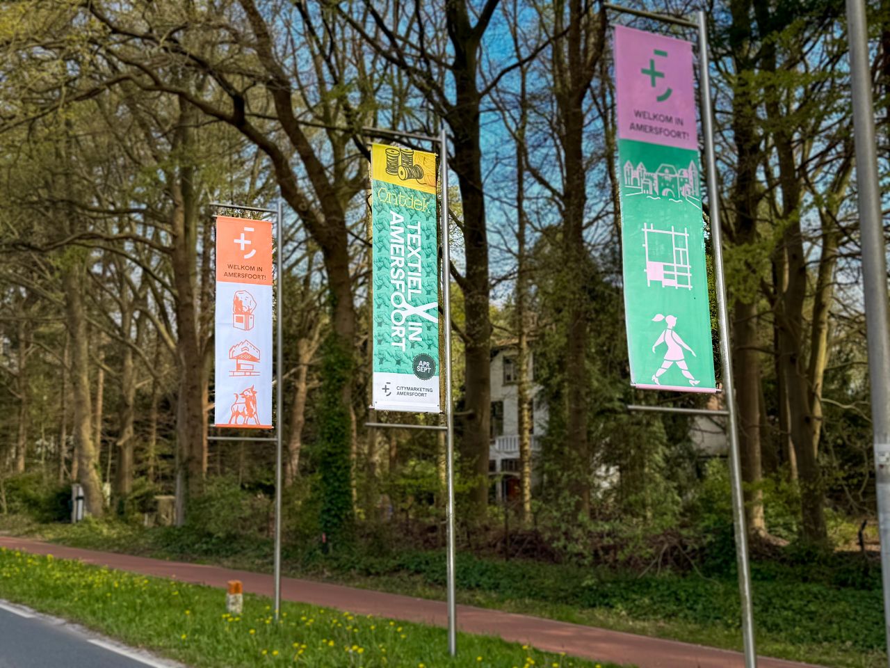 Langs vrijwel alle toegangswegen van Amersfoort zijn onze kleurrijke banieren zichtbaar. Per locatie hangen er drie, waarvan er sinds kort één in het teken staat van het themajaar Textiel in Amersfoort.