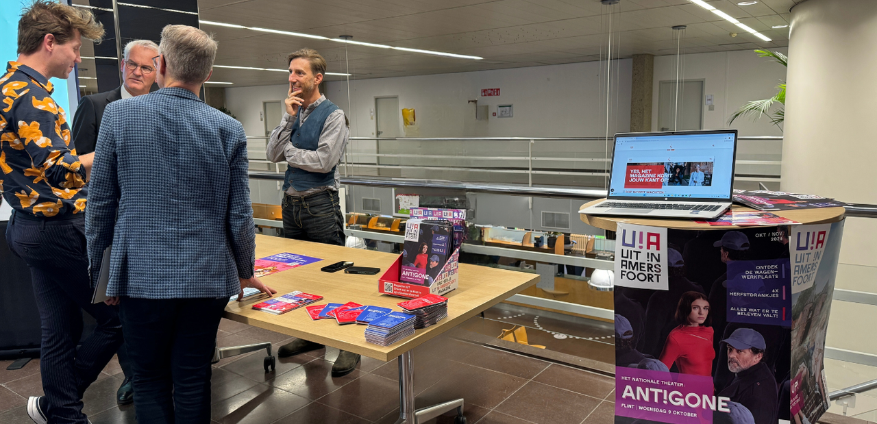 Naast de lancering hebben we ook een promotieactiviteit georganiseerd bij de gemeente Amersfoort. Tijdens de pauze van een raadsvergadering, bekend als 'Het Plein', hebben we een stand gebouwd waar bezoekers het Uit in Amersfoort magazine konden meenemen. Dit was niet alleen een manier om het magazine te promoten, maar ook om nieuwe adressen op te halen van mensen die het magazine voortaan thuis willen ontvangen.